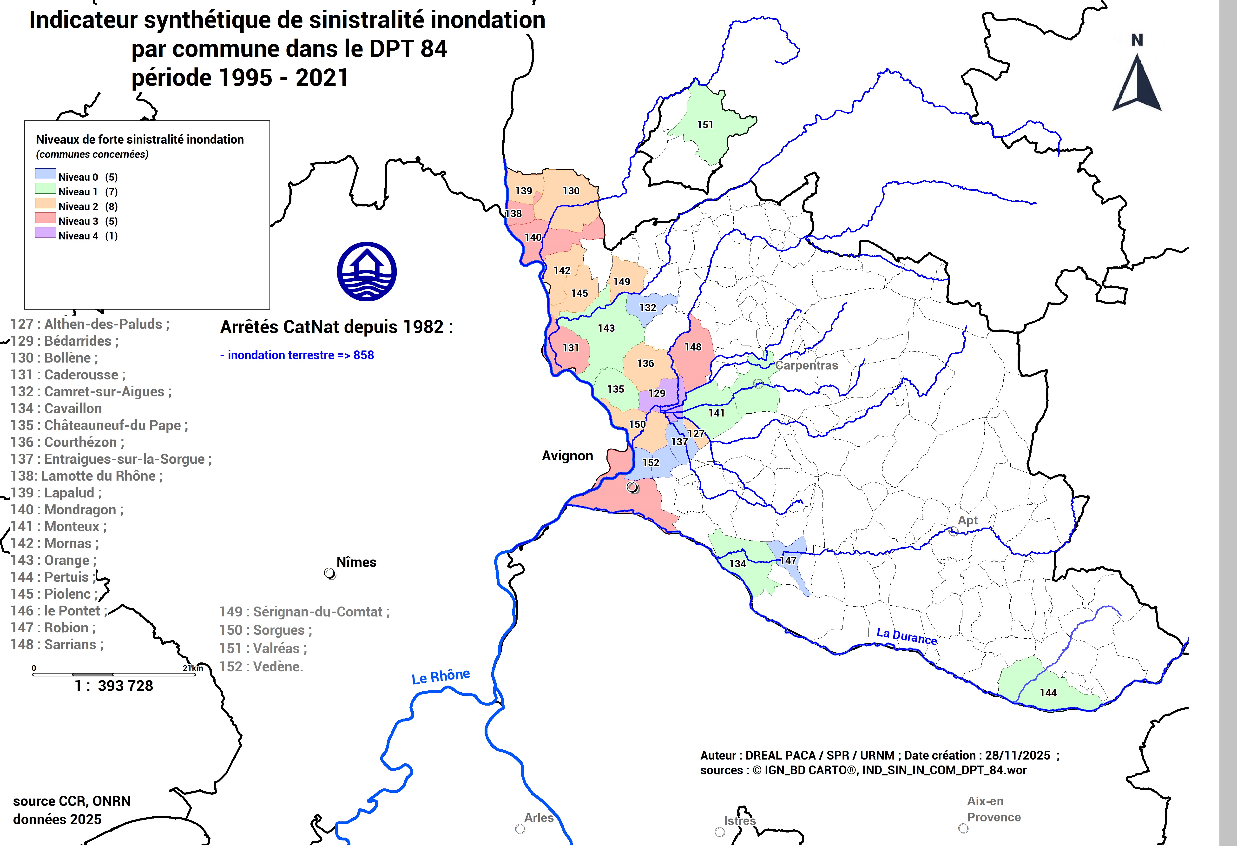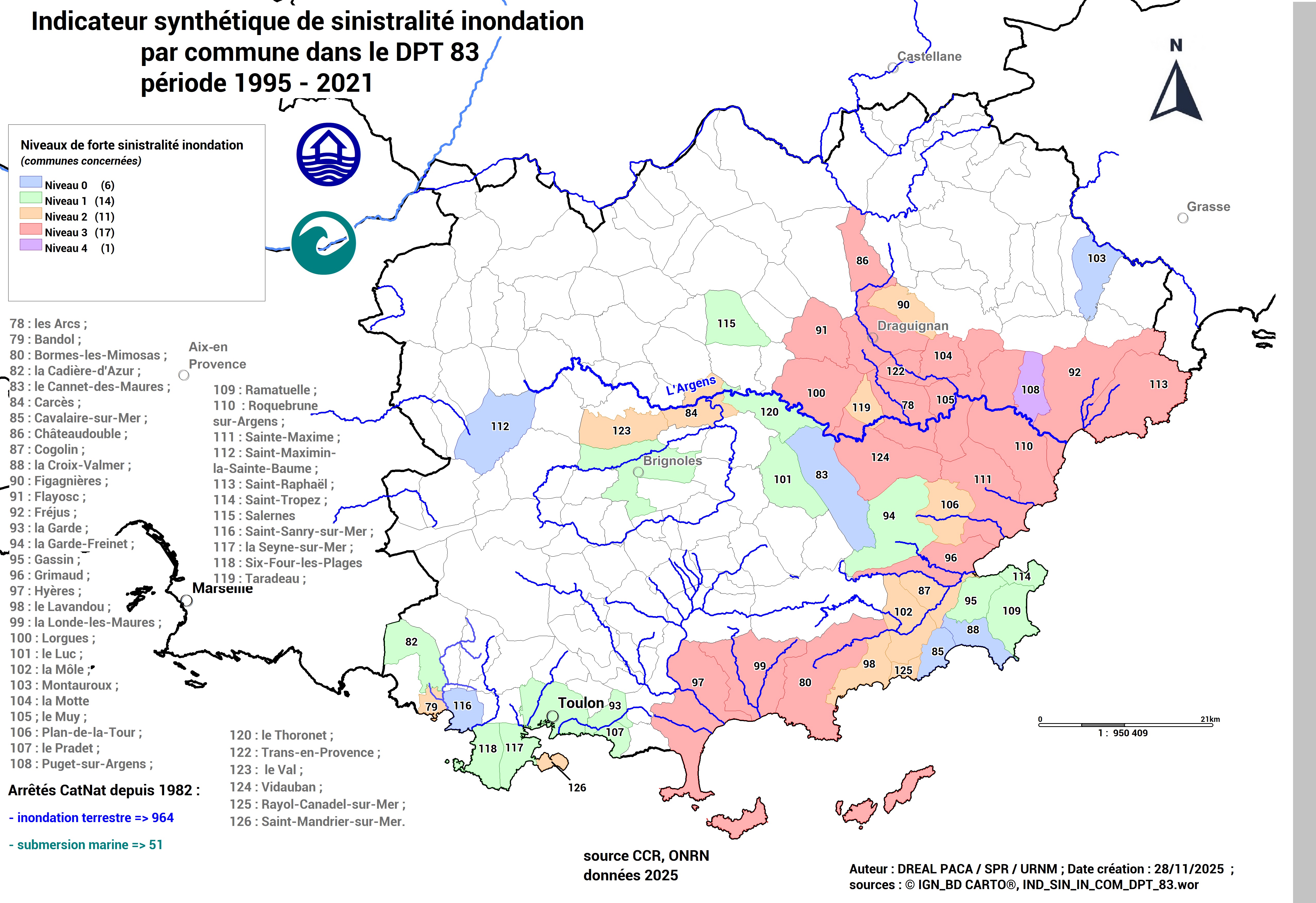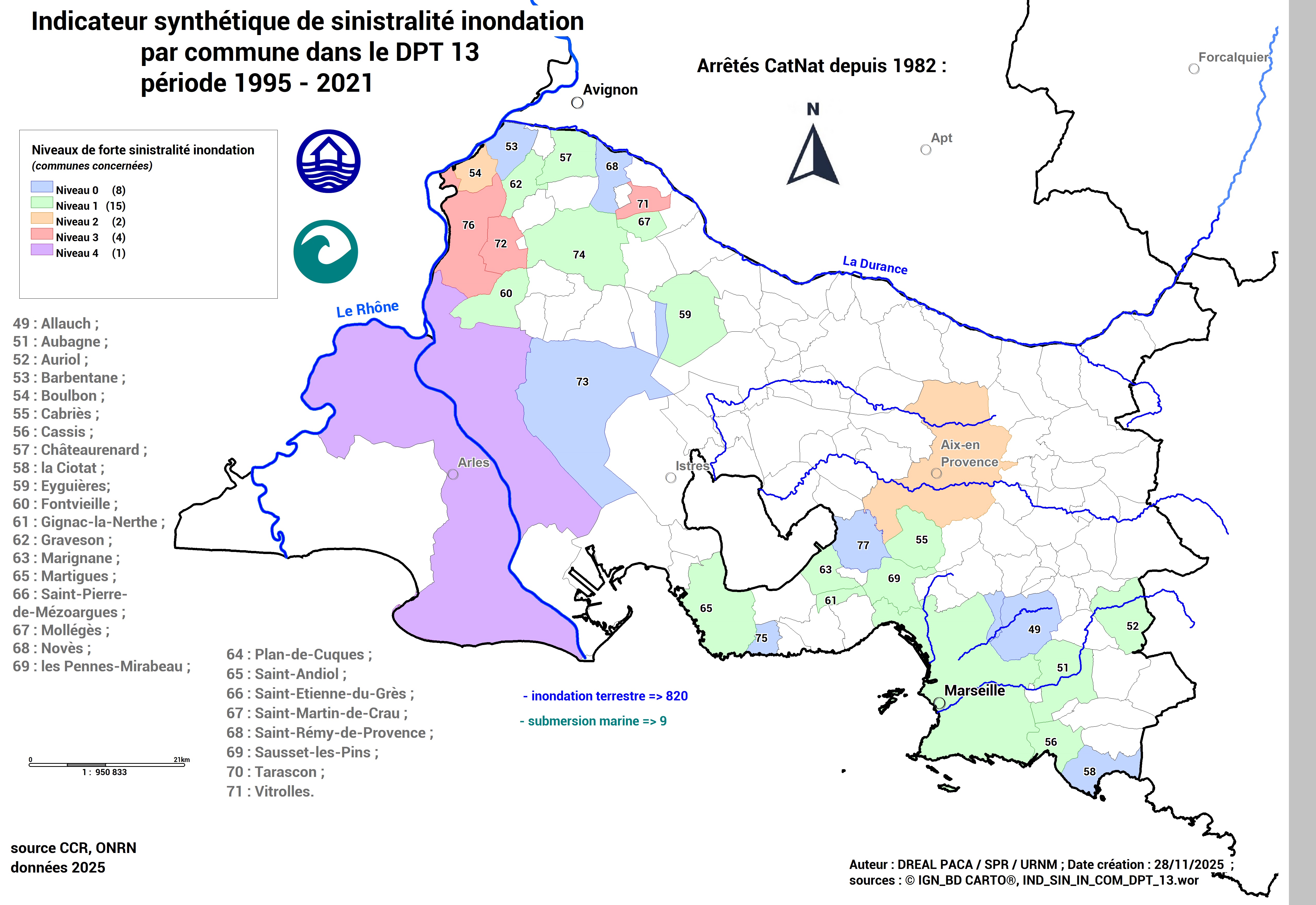 On compte 152 communes dites à « forte sinistralité Inondation » sur la région PACA, dont le coût cumulé est supérieur à 5 M€, regroupées dans les départements des Alpes-Maritimes, des Bouches-du-Rhône, du Var et de Vaucluse.