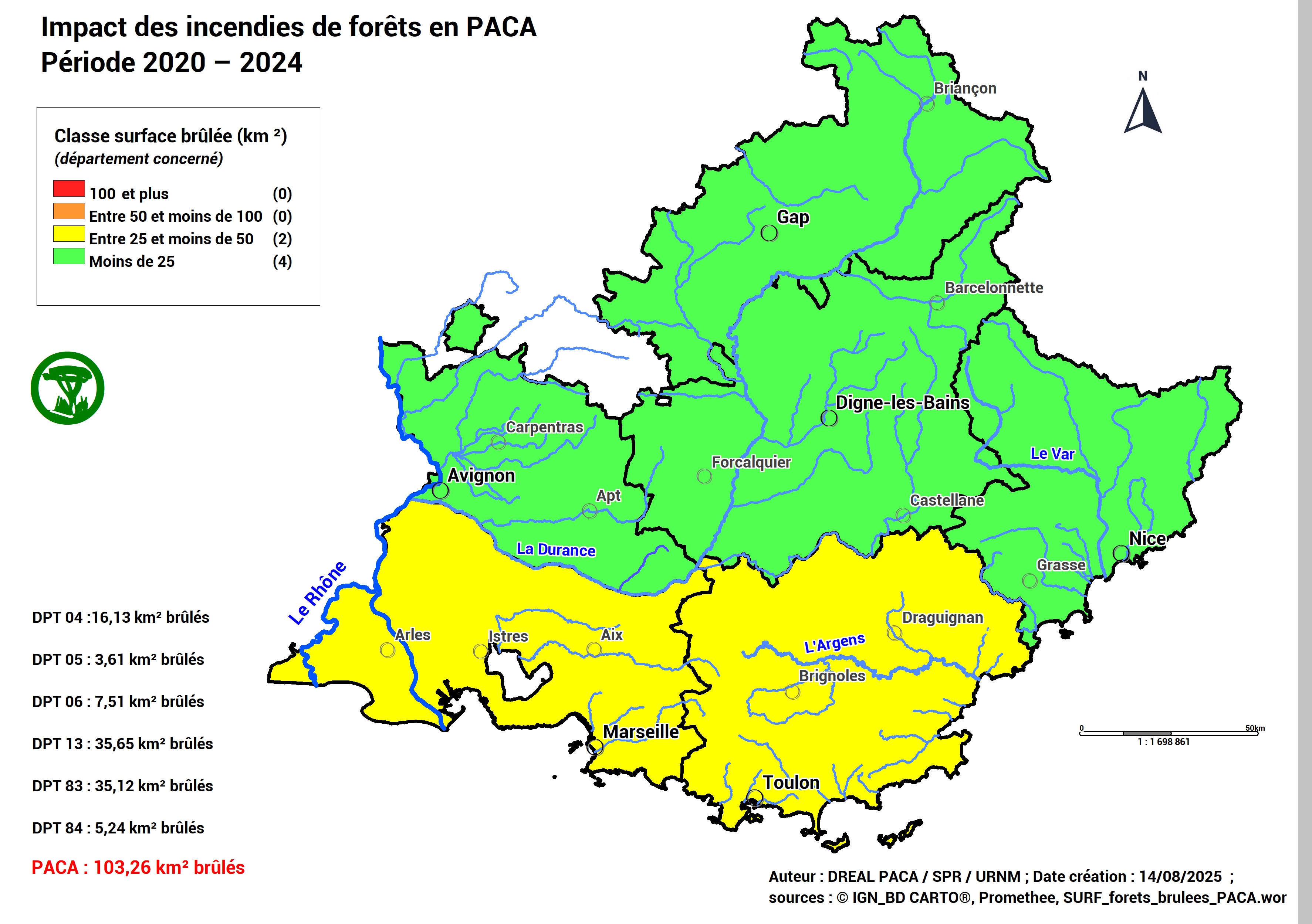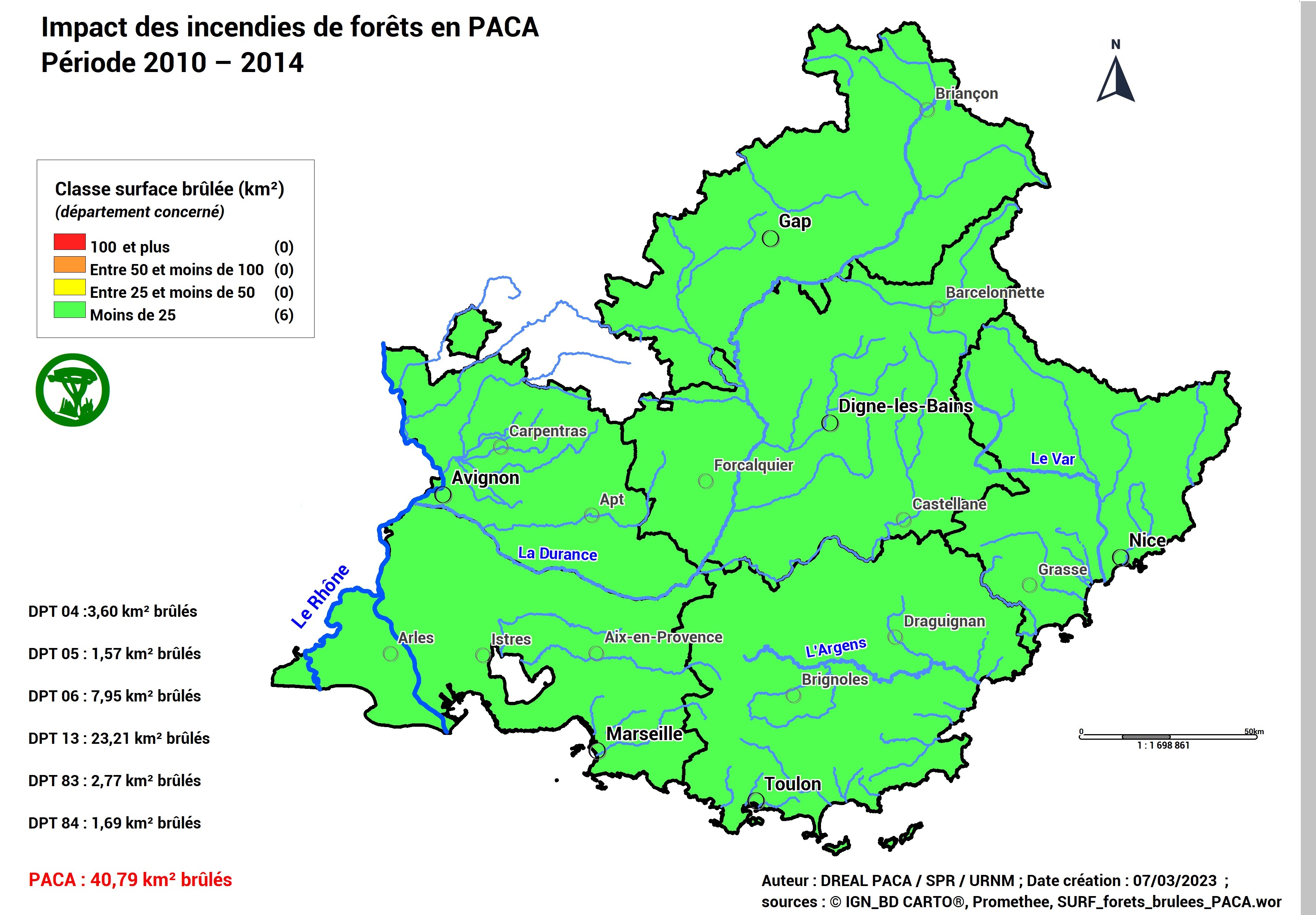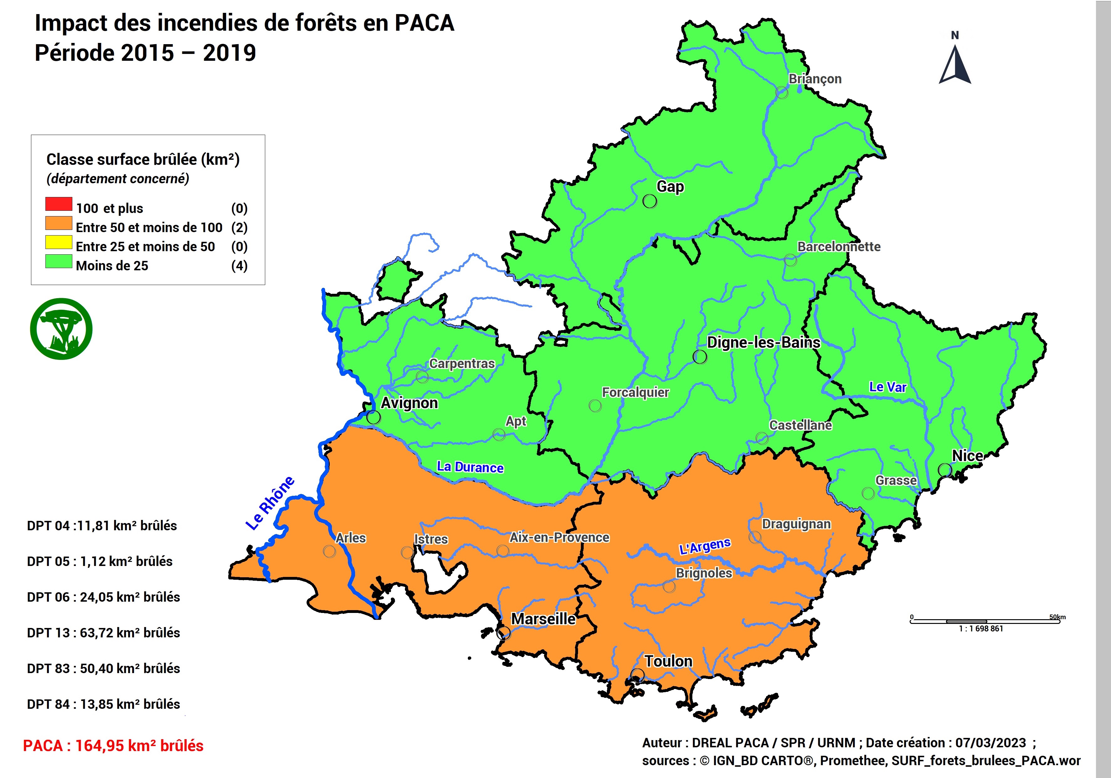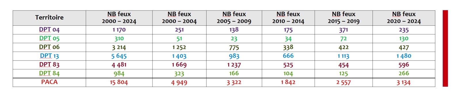 Certains départements de la région sont plus exposés que d’autres car ils présentent une surface forestière importante et aussi de nombreuses constructions à proximité augmentant le risque. C’est le cas des Alpes-de-Haute-Provence, des Alpes-Maritimes et du Var (cf. tableau surface).