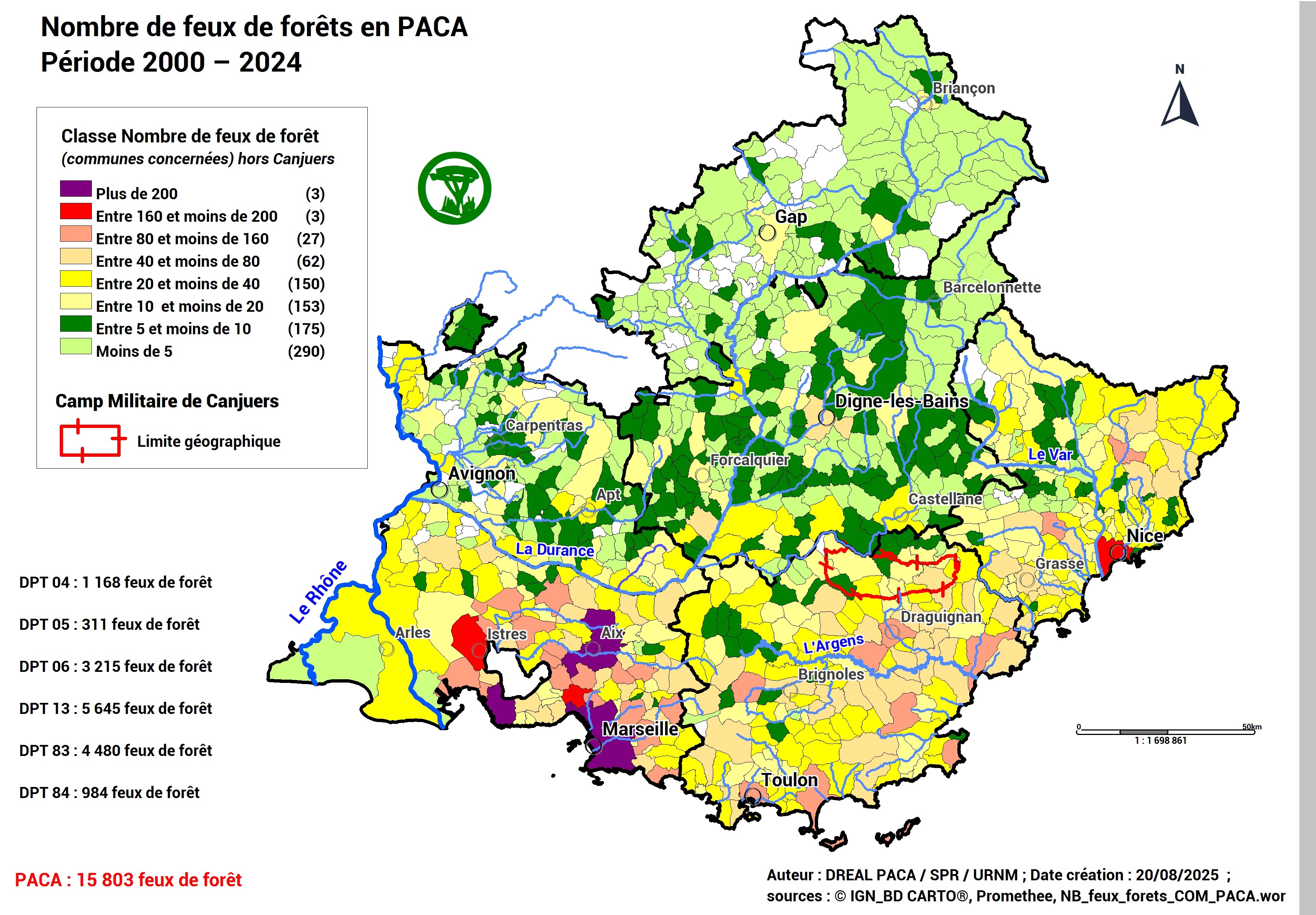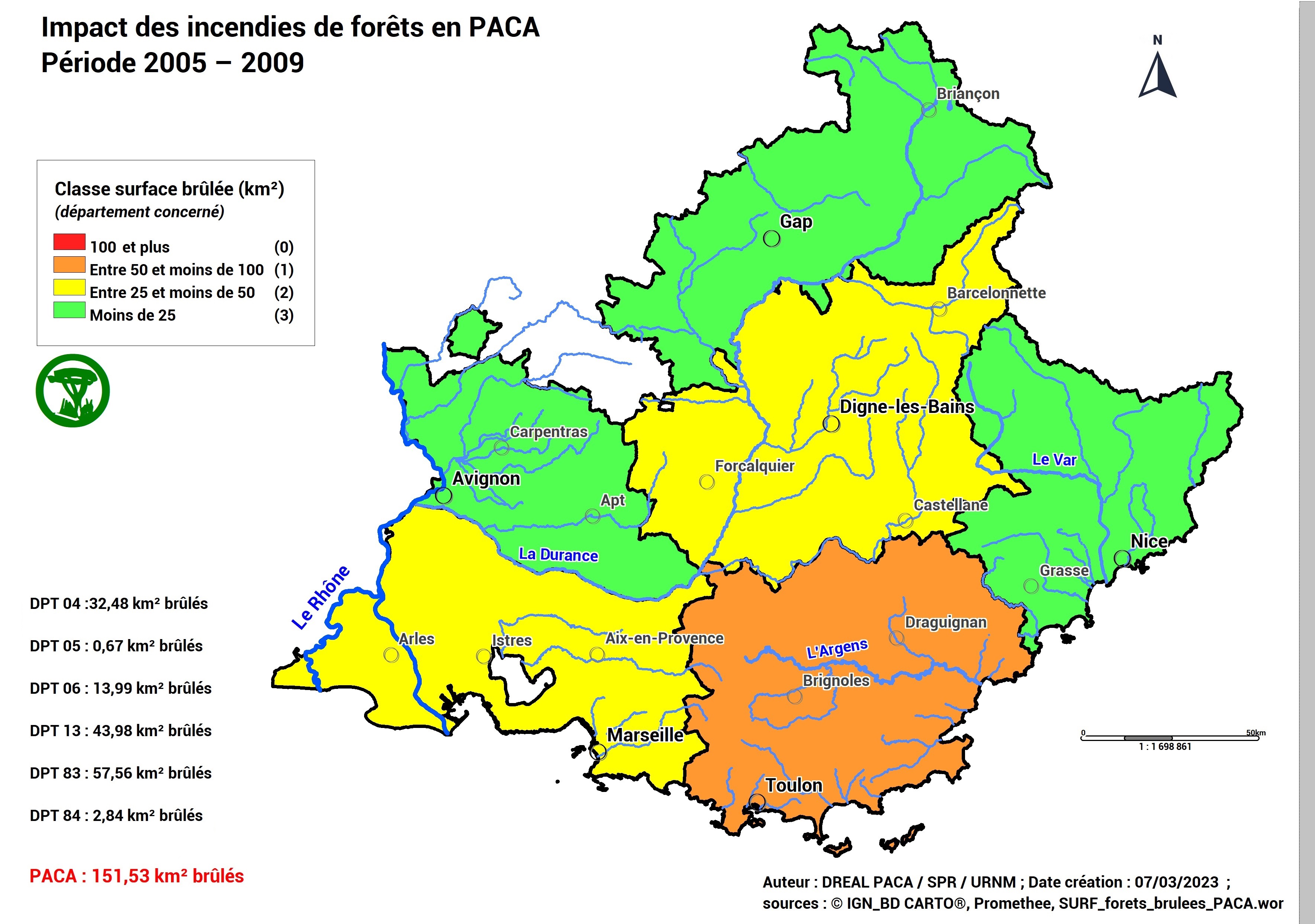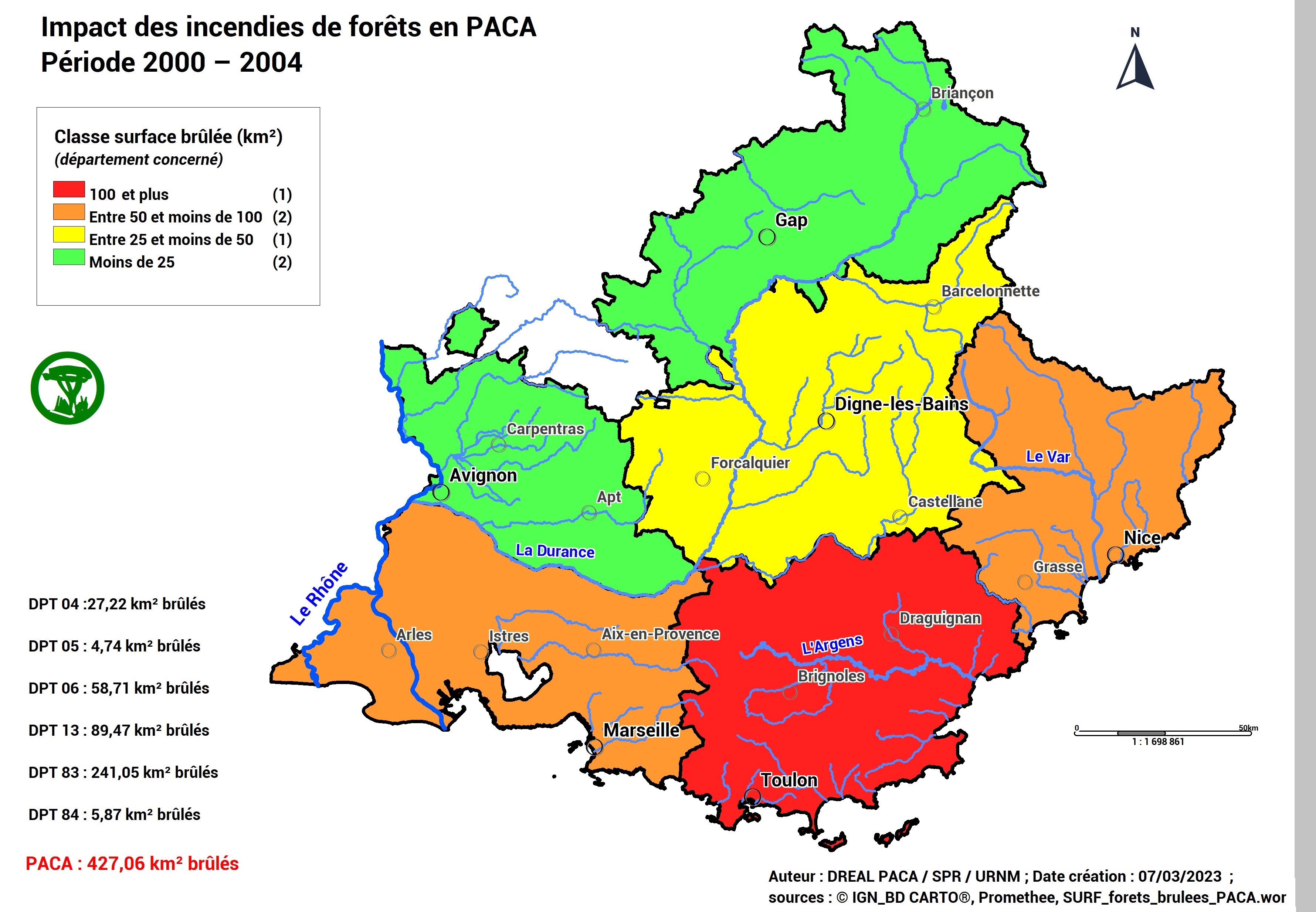 Certains départements de la région sont plus exposés que d’autres car ils présentent une surface forestière importante et aussi de nombreuses constructions à proximité augmentant le risque. C’est le cas des Alpes-de-Haute-Provence, des Alpes-Maritimes et du Var (cf. tableau surface).