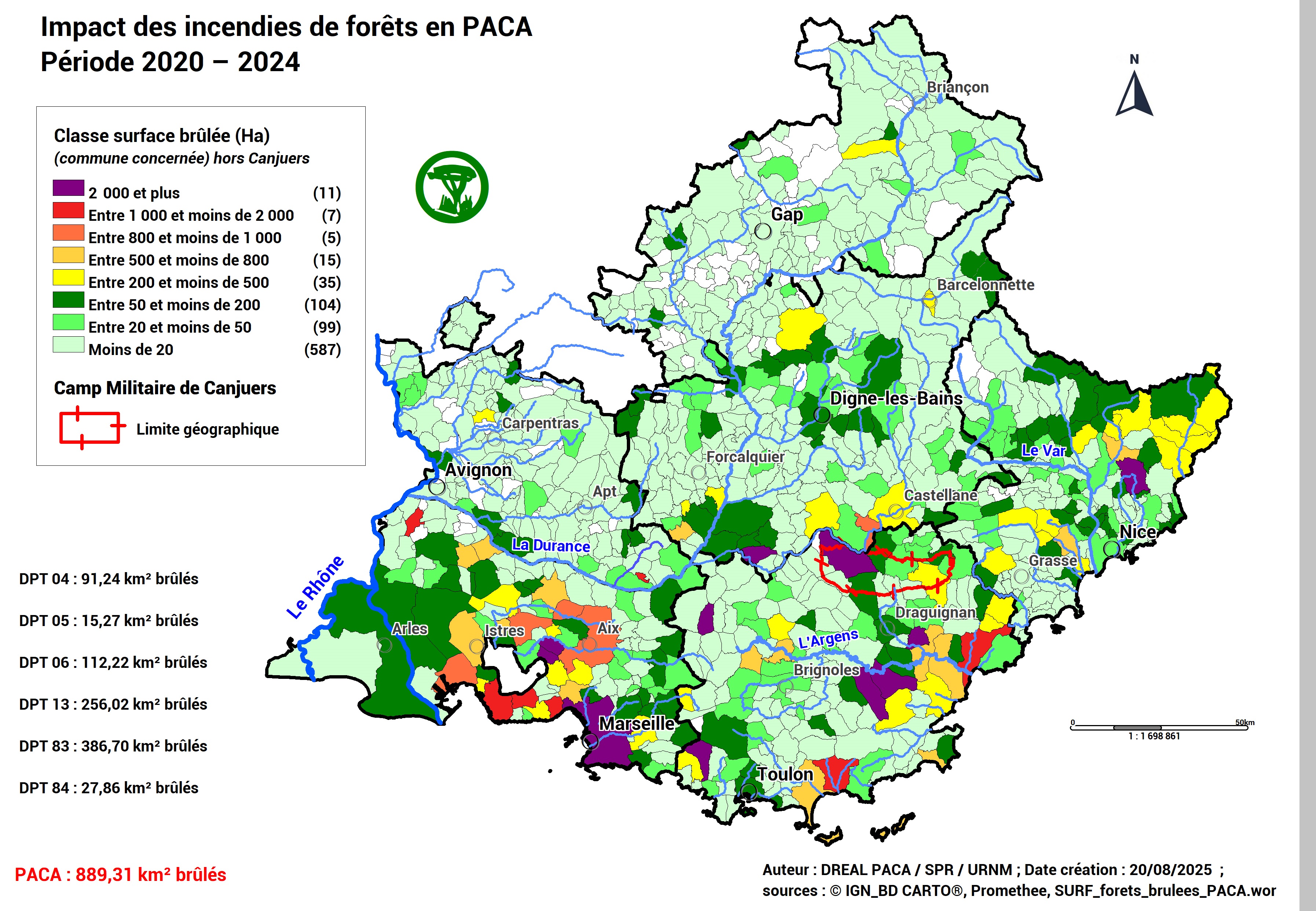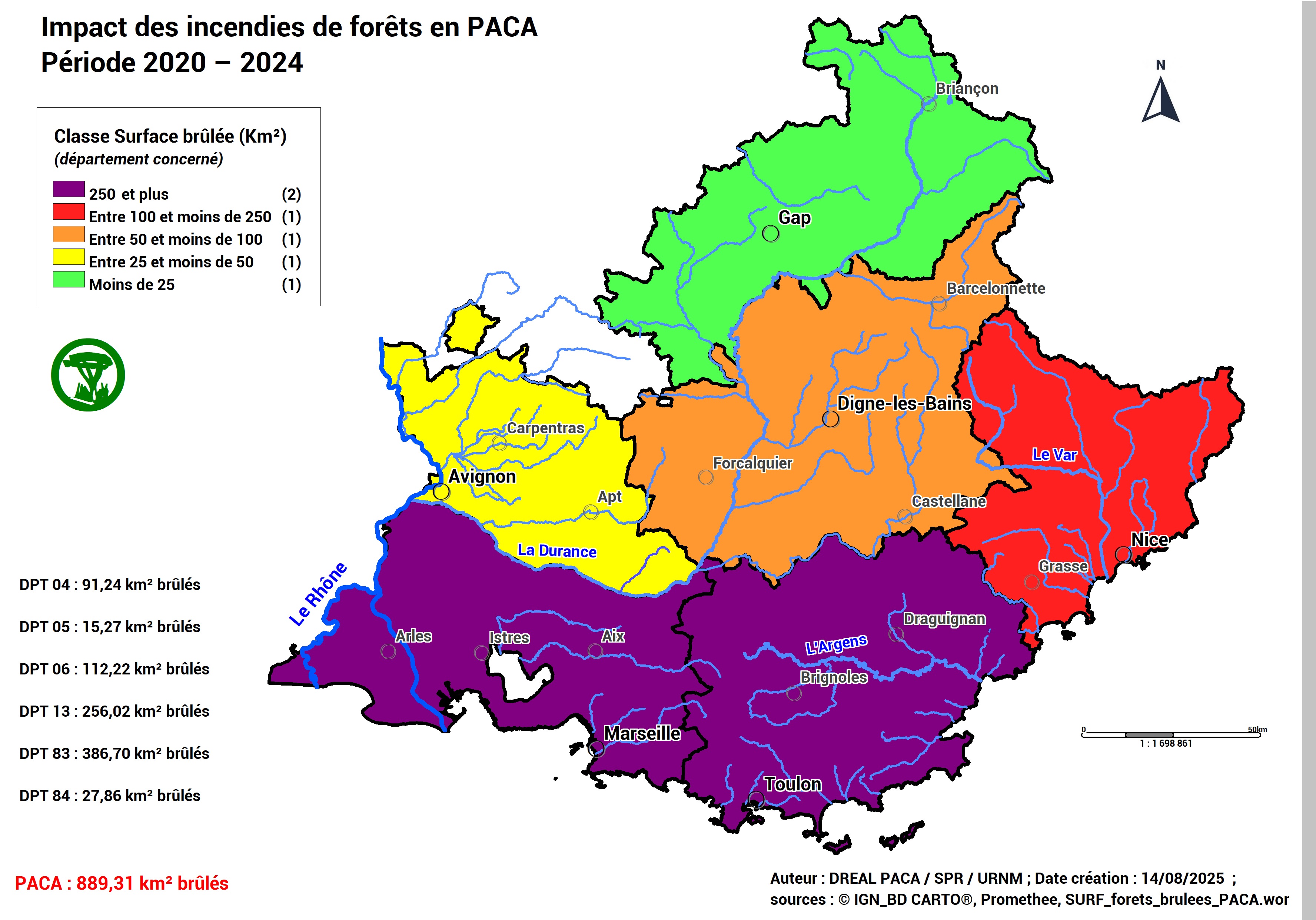 Depuis 2000 en région PACA, pas moins de 889 km² de forêts sont parties en fumée avec des disparités suivant les départements impactés :