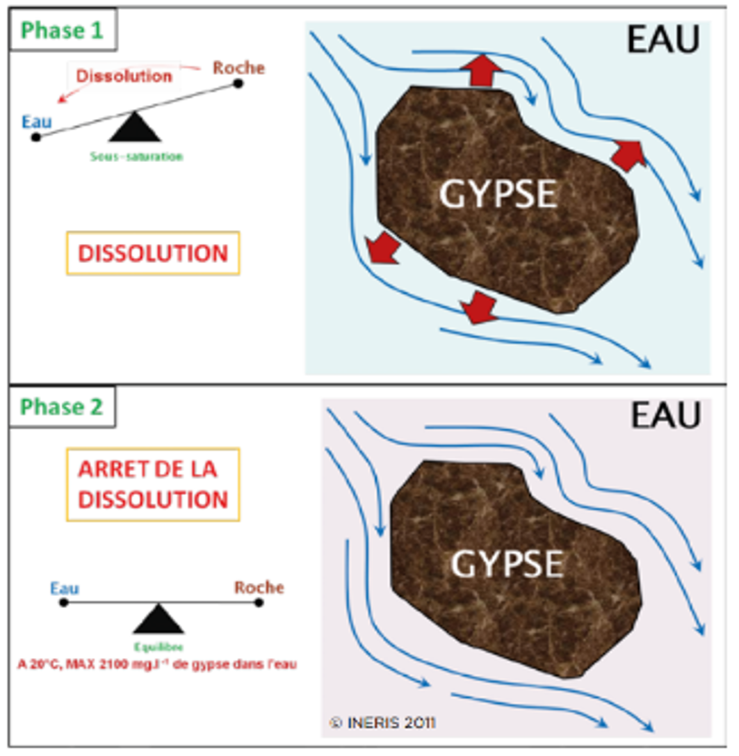 Dans les terrains gypseux ou salins, la dissolution peut être très rapide (possibilité d’apparition de vide d’ampleur dangereuse en quelques dizaines d’années). Dans les calcaires, elle est par contre beaucoup plus lente et n’évolue guère à l’échelle humaine.