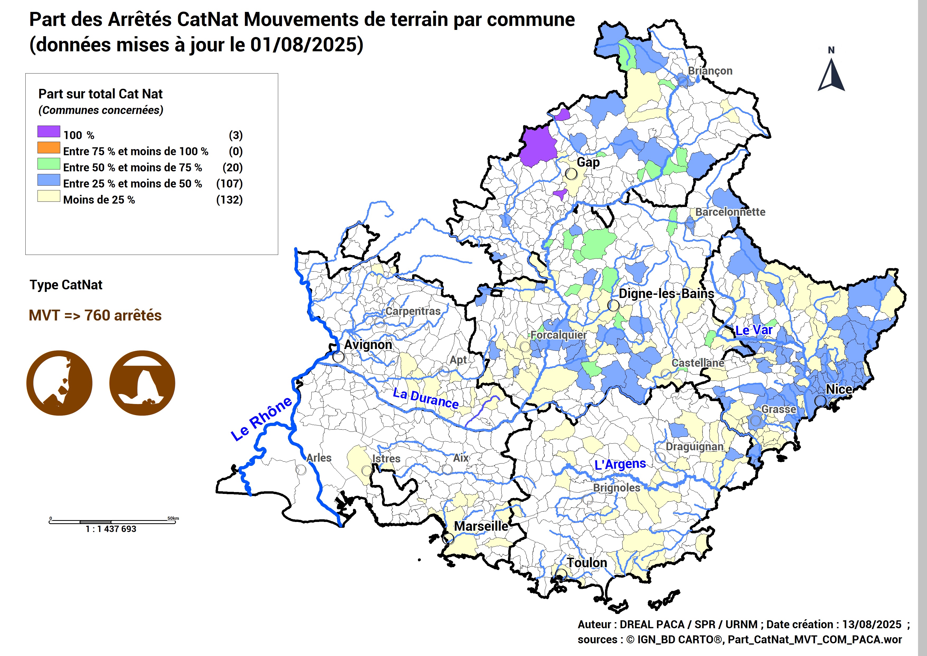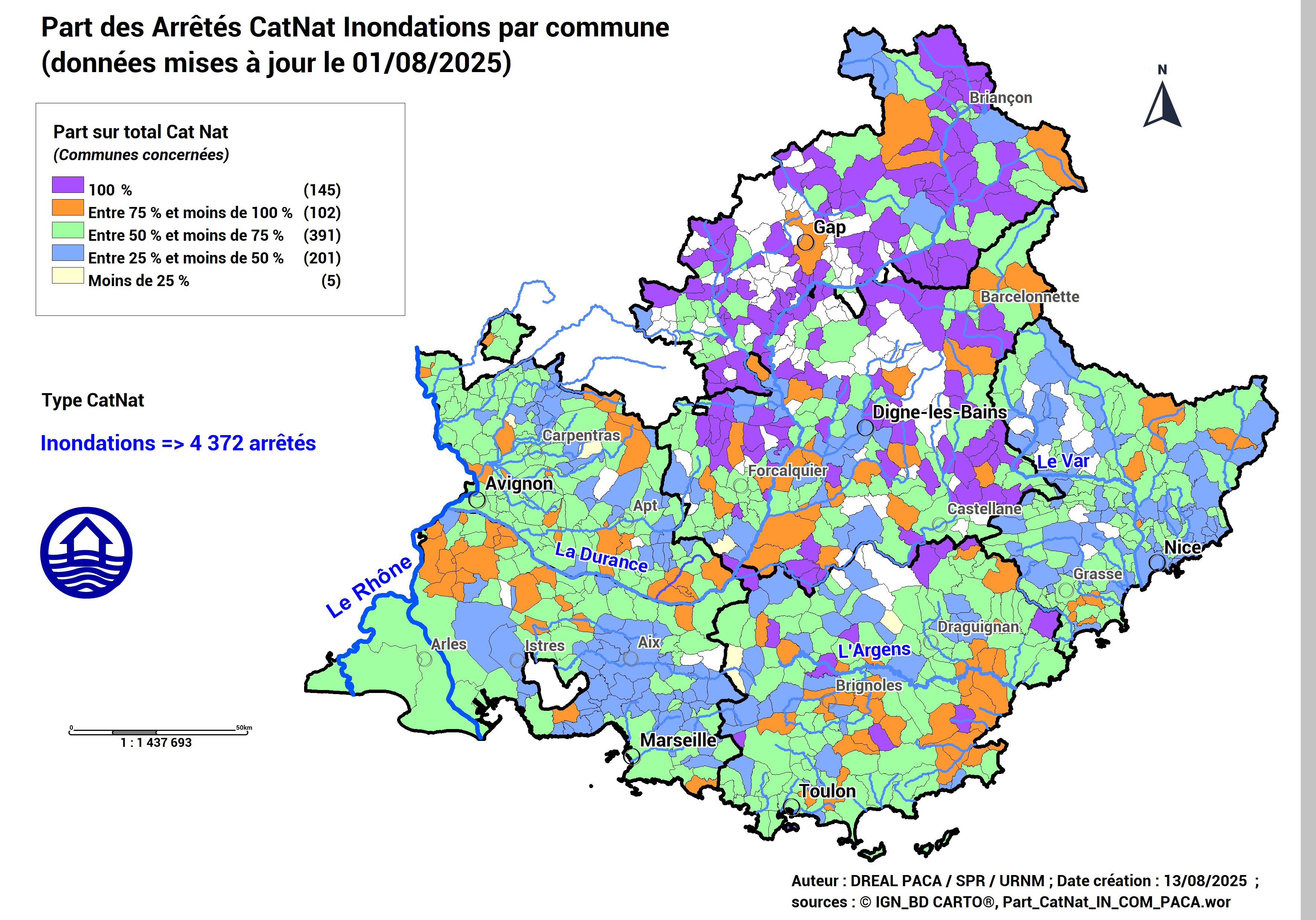- 4 départements particulièrement impactés au regard de la répartition des arrêtés « Cat Nat » : Alpes-Maritimes (2 453), Bouches-du-Rhône (1 493), Var (1 510) et Vaucluse (1 444) ;