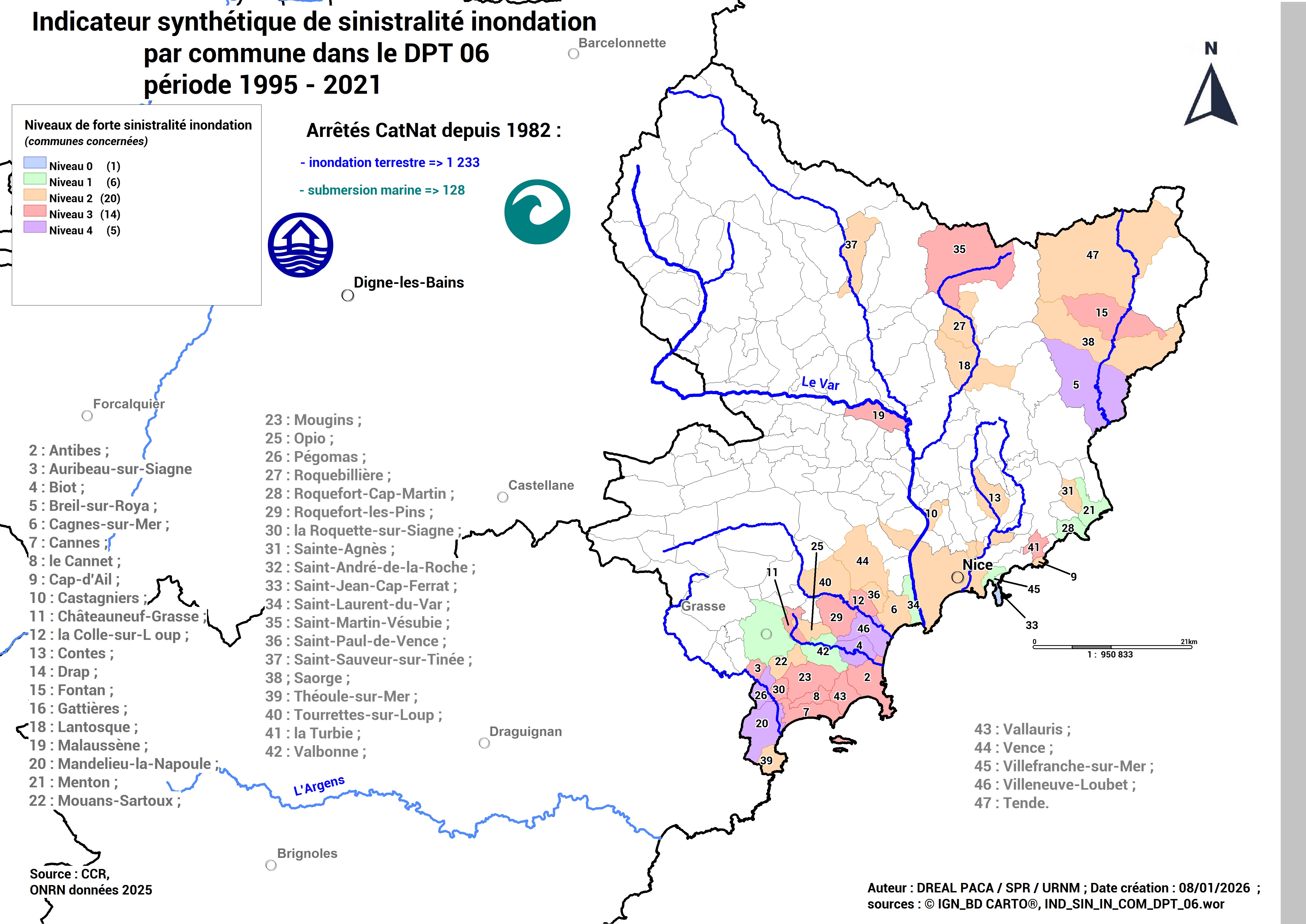 Carte département 06 des communes à forte sinistralité inondation (ONRN, données 2025)