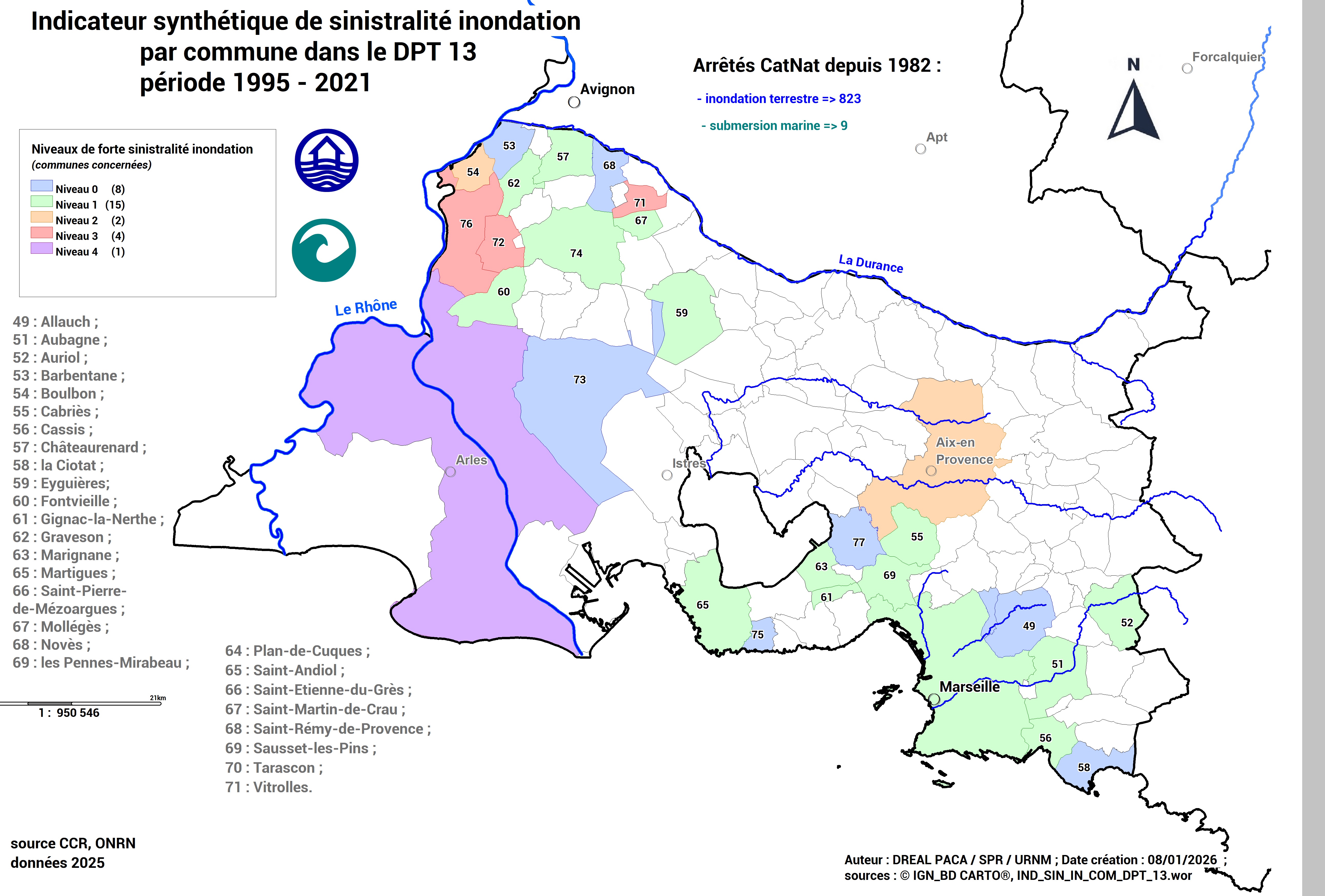 Carte département 13 des communes à forte sinistralité inondation (ONRN, données 2025)