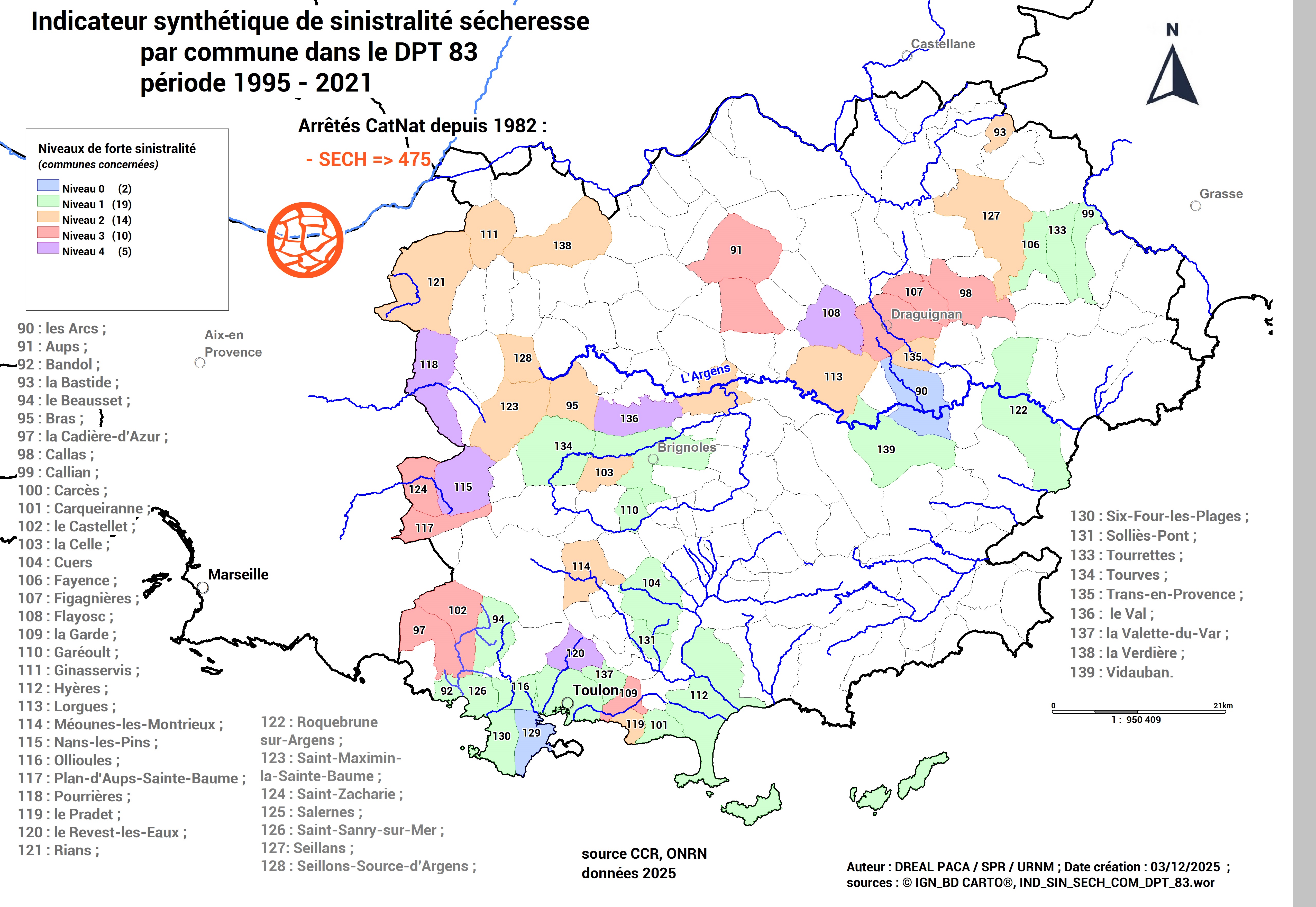 Carte DPT 83 des communes à forte sinistralité « sécheresse » (ONRN, données 2025)
