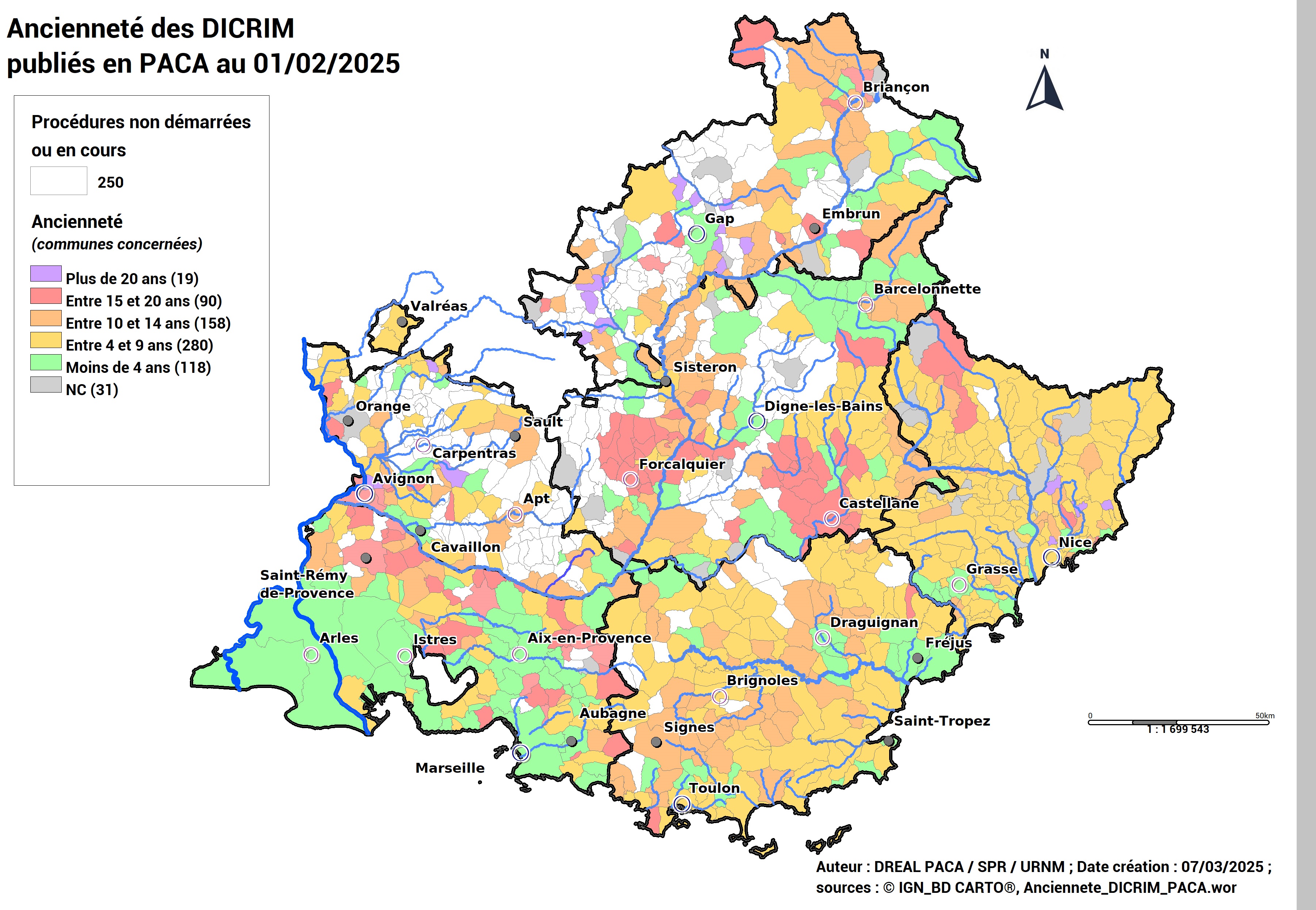Cartographie de l'ancienneté des DICRIM publiés en PACA au 01/02/2025
