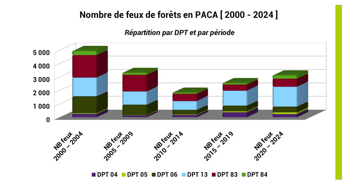 Nombre de feux de forêt recensés en PACA et par dpt sur la période 2000 - 2024 [ graphique détaillé par période ]