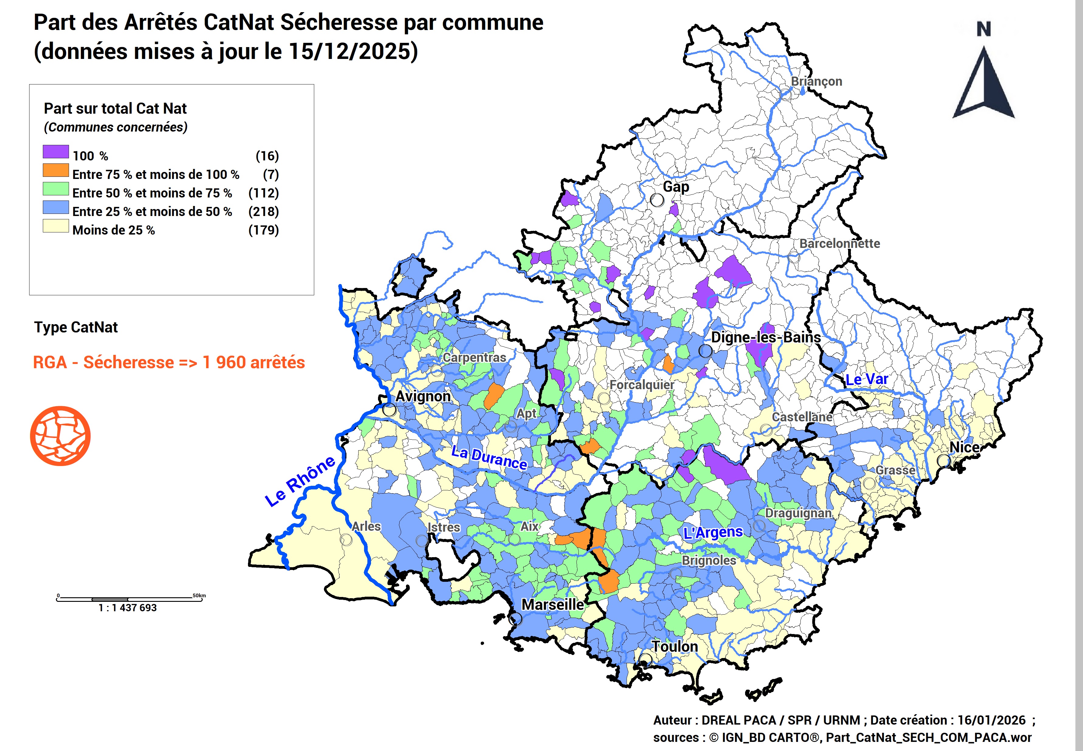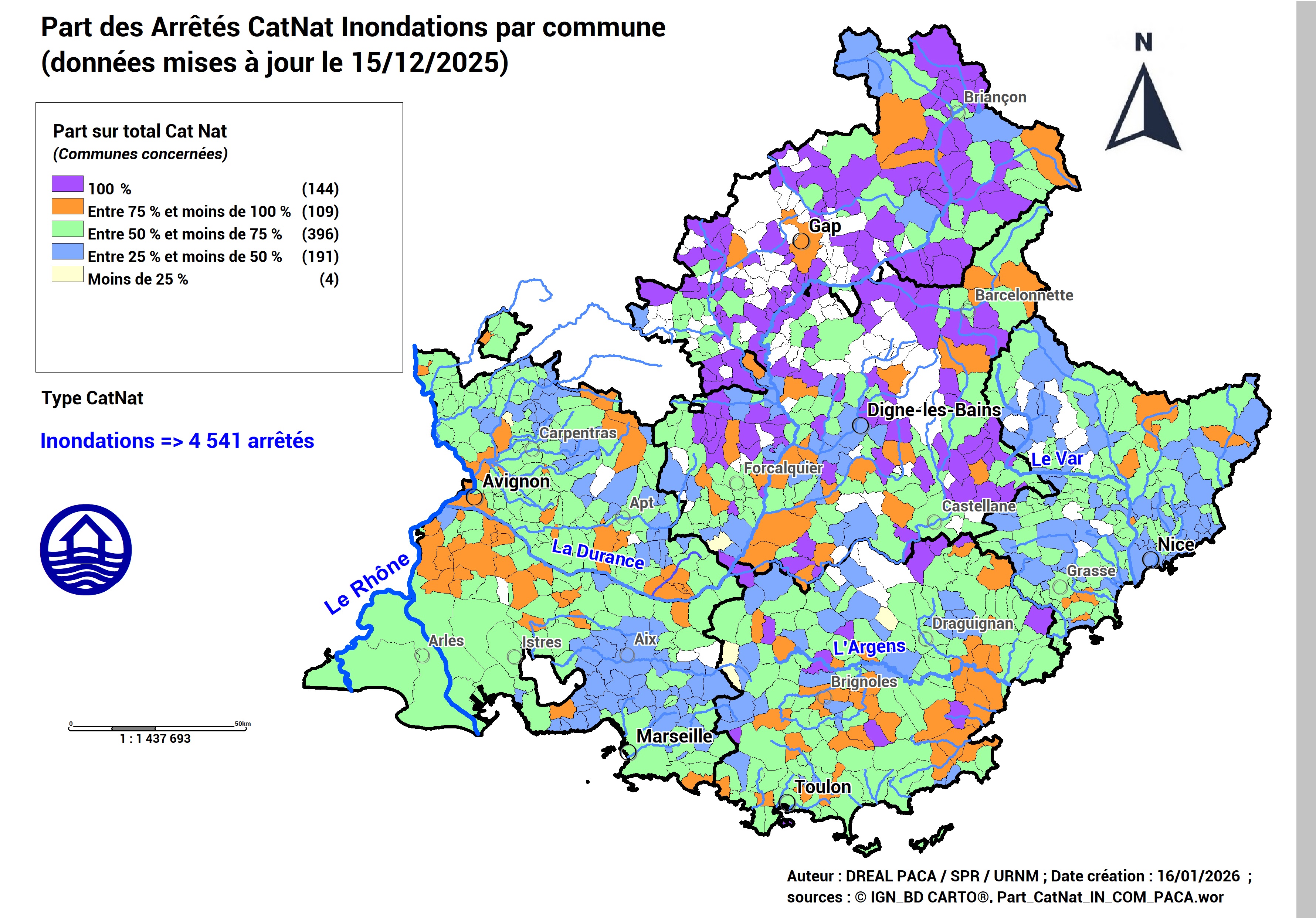 - 4 départements particulièrement impactés au regard de la répartition des arrêtés « Cat Nat » : Alpes-Maritimes (2 465), Bouches-du-Rhône (1 575), Var (1 540) et Vaucluse (1 488) ;